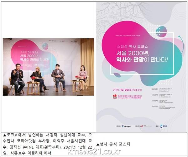 ‘서울 2000년, 역사와 관광이 만나다’는 송파구의 한성백제 역사문화자원을 관광자원으로 보다 활성화할 방안 등을 주제로 한 온라인 토크쇼로, 이익주 서울시립대 교수, 서경덕 성신여대 교수 등이 발표자와 패널로 참여했다.