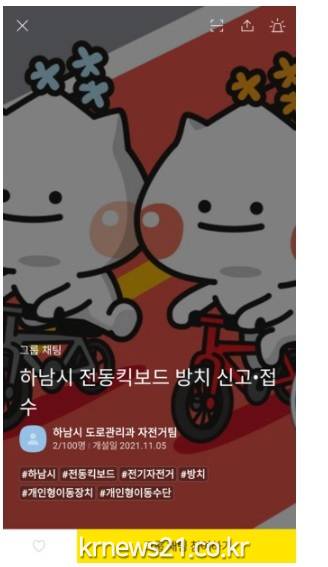 ▲ 사진=하남시하남시(시장 김상호)는 길거리에 방치돼 시민 불편을 초래하는 민간 공유 전동킥보드를 신고하고 처리결과를 확인할 수 있는 ‘카카오톡 오픈 채팅방’을 20일부터 시범 운영한다고 밝혔다.