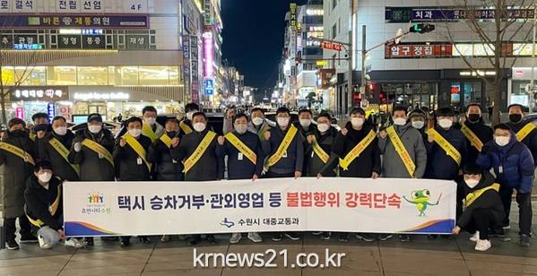 ▲ 사진=수원시수원시가 전국택시노동조합연맹 수원시지부, 수원시 개인택시조합과 함께 21일 오후 9시부터 이튿날 오전 2시까지 ‘2021년 민·관 합동 택시불법행위 집중단속’을 진행했다