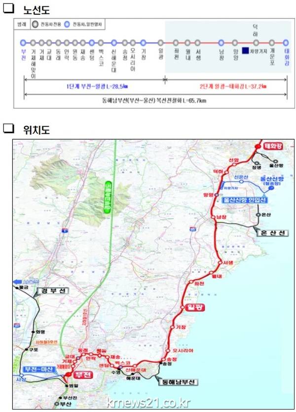 부산과 울산을 잇는 복선전철인 동해선은 총사업비 2조 8,270억 원이 투입됐으며, 지난 2003년부터 추진됐다. 전체 65.7km, 23개 역 중 2016년 1단계 구간인 부전~일광 28.5km, 15개 역이 먼저 개통됐고, 이번에 2단계 구간인 일광~태화강 37.2km, 8개 역이 개통하게 됐다.