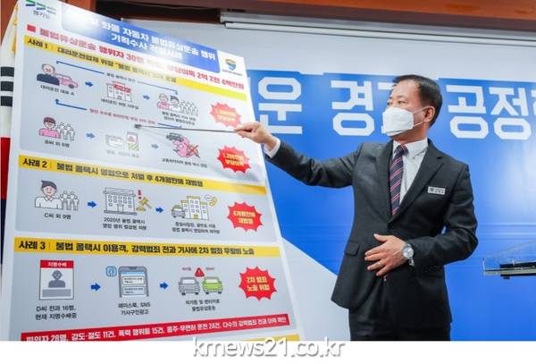 김영수 경기도 공정특별사법경찰단장은 27일 경기도청에서 기자회견을 열고 “올해 9월부터 12월까지 여객 및 화물자동차 불법유상운송 기획수사를 진행한 결과, 불법 유상운송행위 알선 업주 및 운전기사 28명, 자가용을 이용한 불법화물운송 차주 2명을 적발해 6명을 검찰에 송치하고 24명을 형사입건해 수사 중”이라고 밝혔다.