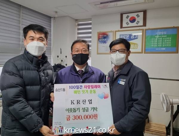 ▲ 사진=의정부시의정부시 소재 KR산업(대표 박종화)은 12월 28일 송산1동주민센터(동장 김진수)에 방문해 이웃돕기 성금 30만 원을 전달하며 100일간 사랑릴레이 배턴 잇기 운동에 동참했다.