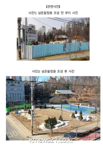 ▲ 사진=양천구양천구(구청장 김수영)가 공사자재 등이 적치돼있어 그간 방치되어온 놈은 들고 원앞 사유지(신정동 1287)를 매입해‘놈은 들 정원’으로 조성하고 지난 29일 지역주민에게 개방했다고 밝혔다.