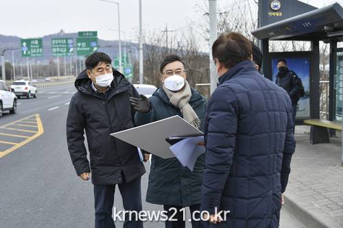정하영 김포시장이 김포대로 고촌 신곡사거리~서울 개화역 방향으로 설치된 버스전용차로 현장을 5일 점검했다.