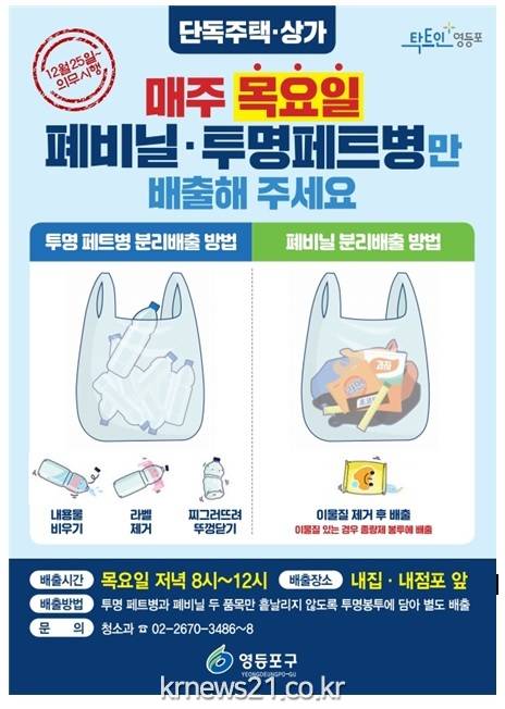 ▲ 사진=영등포구지난 25일부터 영등포구(구청장 채현일)의 단독주택과 상가에서는 매주 목요일에 투명 페트병과 폐비닐만 배출할 수 있게 됐다.