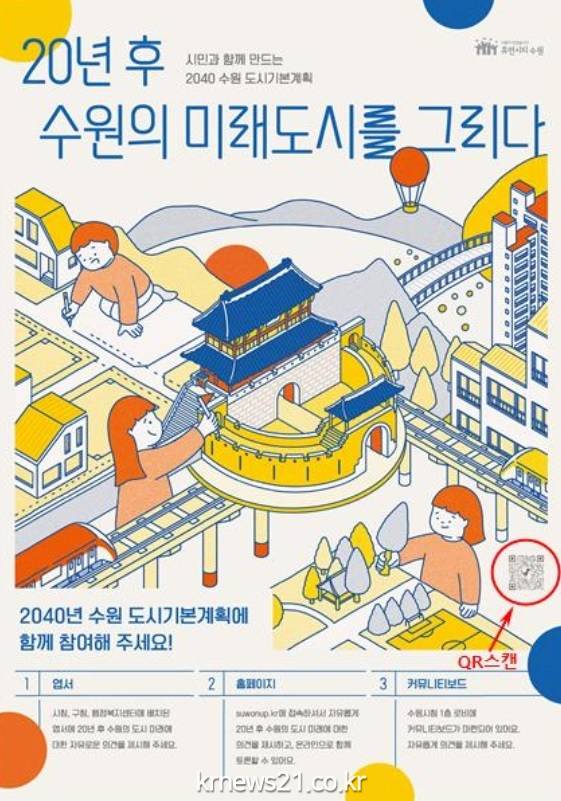 수원시는 시·구청, 행정복지센터, 공동주택 승강기 등 곳곳에 2040 수원도시기본계획 안내 홍보물을 비치해 시민들의 참여를 이끌 계획이다. 홍보물에 새겨진 큐알(QR) 코드를 스마트폰으로 스캔해 간편하게 의견과 아이디어를 제안할 수 있다.