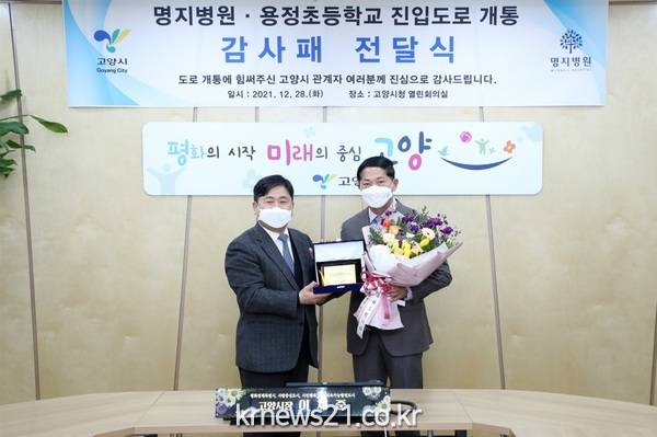▲ 사진=고양시고양시(시장 이재준)가 호국로에서 명지병원을 직접 연결하는 진입도로를 개설한 것에 대한 감사 표시로 명지병원으로부터 감사패를 전달받고 지난 28일 전달식을 개최했다.