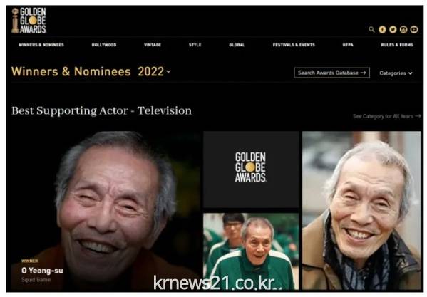 ▲ 사진=골든글로브 홈페이지 캡처문재인 대통령이 한국인 배우 최초로 미국 골든글로브 연기상을 받은 배우 오영수에게 축하의 말을 전했다.