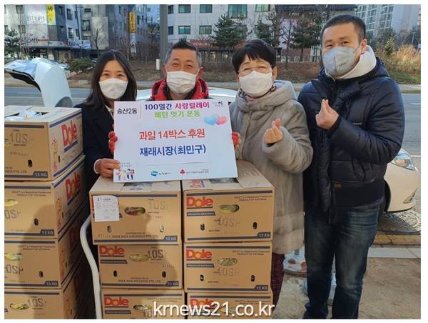 재래시장 과일가게는 2020년 2월부터 매월 정기적으로 나눔을 실천하여 송산2동 착한이웃 1호점으로 선정된 바 있다. 올해에도 어려운 이웃을 위한 따뜻한 마음을 잊지 않고 과일 126상자를 후원, 취약계층 400여 가구에 신선한 먹거리를 제공했다.