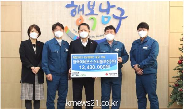 ▲ 사진=울산광역시울산 남구(구청장 서동욱)는 한국이네오스스티롤루션(주)(대표 이종후)이 7일 오전 남구청을 방문하여 어려운 이웃을 위한 성금 1,343만원을 울산사회복지공동모금회에 지정기탁했다고 밝혔다.