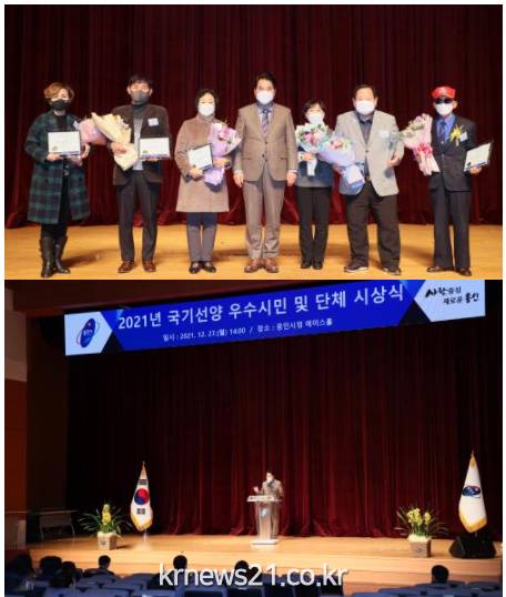▲ 사진=용인시용인시가 27일 시청 에이스홀에서 ‘2021년 국기선양 우수 시민 및 단체 시상식’을 열고 태극기 달기 활성화에 기여한 시민과 단체 38명(곳)에 표창을 수여했다.