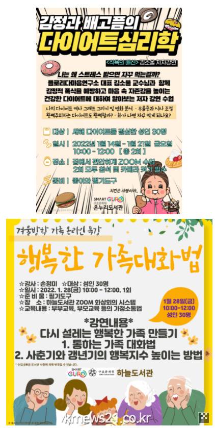 구로구가 1월 매주 금요일 화상회의 프로그램 줌(ZOOM)을 통해 특강을 펼친다. 먼저 14, 21일 오전 10시부터 12시까지 2시간 동안 온누리도서관에서 ‘감정과 배고픔의 다이어트 심리학’ 강연이 진행된다.