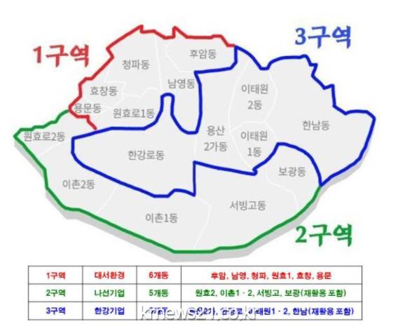 한강로동은 2008년 한강로1·2·3동이 1개 동으로 통합됐으나 청소대행업체는 일원화되지 않아 주민 불편이 있어왔다. 이번 개편으로 한강로동 수거 대행 업체는 1곳으로 조정된다.