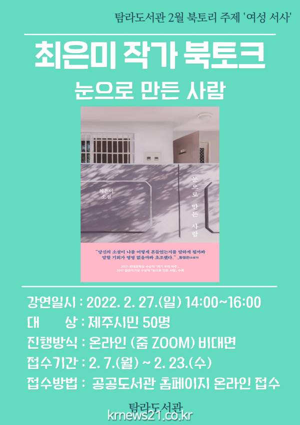 ▲ 사진=제주시청제주시 탐라도서관에서는 2월 북토리 주제‘여성 서사’와 관련해, 최은미 작가의 단편집 『눈으로 만든 사람』 온라인 북토크를 오는 2. 27.(일) 14:00에 개최한다.