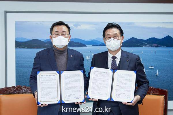 ▲ 사진=통영시통영시와 한산농업협조합(대표 최재형)은 2022년 2월 8일 통영시청 시장실에서 통영시와 한산농협 관계자가 모인 가운데 통영-한산 여객선 야간운항을 위한 업무협약을 체결하였다.