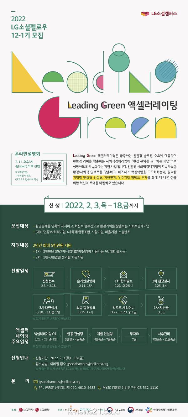 선정된 LG소셜펠로우 12-1기 기업에는 최대 5000만원을 지원하며 리딩그린(Leading Green) 액셀러레이팅을 통해 친환경 사회적경제기업으로 성장할 발판을 마련한다.