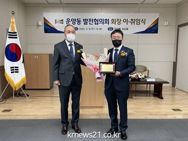 ▲ 사진=김포시김포시 운양동 발전협의회는 지난 9일 동 모담홀에서 2022년 정기총회를 개최하고 회장 이․취임식을 진행했다. 이번 회의는 감염병 확산 방지를 위해 방역패스를 적용하여 20여명의 임원들만 참석하여 운영됐다.