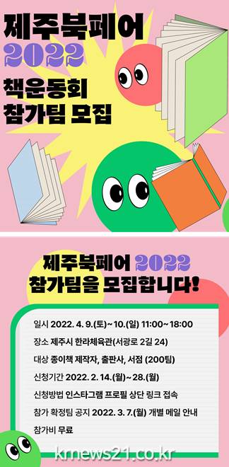 모집 기간은 오는 2월 14일부터 28일까지로, 제주북페어 공식 인스타그램(@jejubookfair_2022) 신청 링크를 통해 접수할 수 있다.