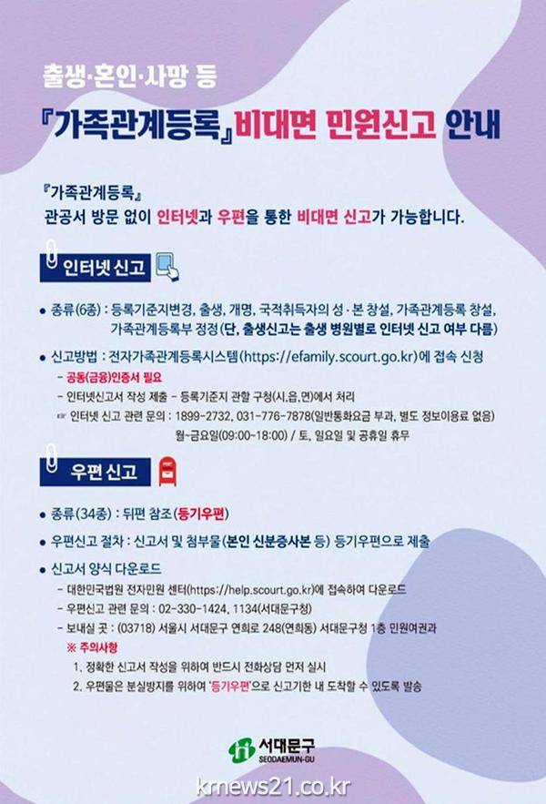▲ 사진=서대문구서대문구가 생활 속 거리두기 실천의 일환으로 ‘비대면 가족관계등록신고’ 활성화 계획을 연중 추진한다.