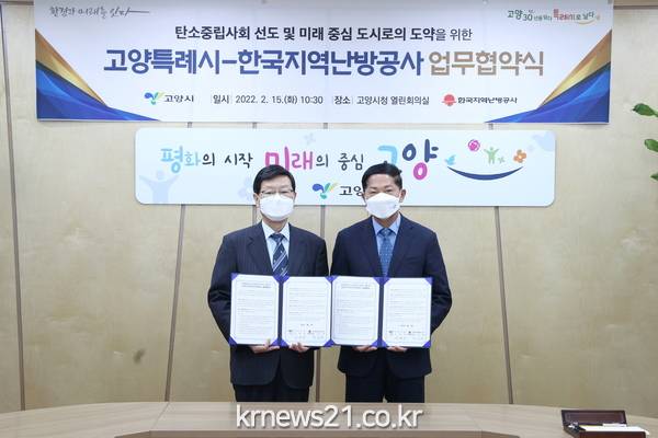 ▲ 사진=고양시고양시(시장 이재준)는 2월 15일 고양시청 열린회의실에서 한국지역난방공사(사장 황창화)와 ‘탄소중립사회 선도 및 미래 중심도시로의 도약을 위한 업무협약’을 체결했다고 밝혔다.
