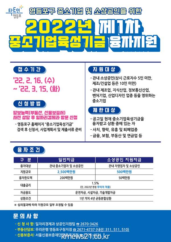 기타 자세한 사항은 영등포구청 홈페이지(https://www.ydp.go.kr)에서 “중소기업육성기금”을 검색하거나 일자리경제과(☎02-2670-3426)로 문의하면 된다.