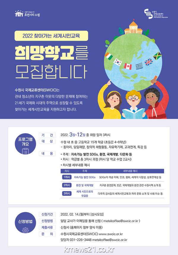 세계시민교육은 학급별 담당 교사가 신청할 수 있다. 수원시국제교류센터 홈페이지(https://www.swcic.or.kr) ‘공지사항’에 게시된 ‘2022 찾아가는 세계시민교육 참여 학급 모집’에서 신청서를 내려받아 작성 후 전자우편(metalcoffee@swcic.or.kr)으로 제출하면 된다.