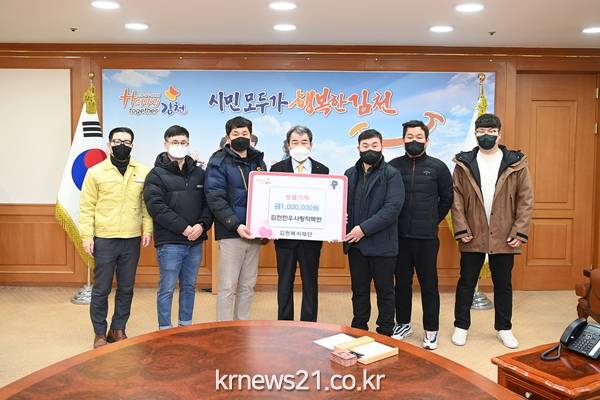 ▲ 사진=김천시김천한우사랑작목반(작목반장 정태수)은 14일 복지 사각지대의 불우이웃 돕기에 동참하고자 김천시(시장 김충섭)를 방문해 성금 100만원을 김천복지재단에 기탁했다.