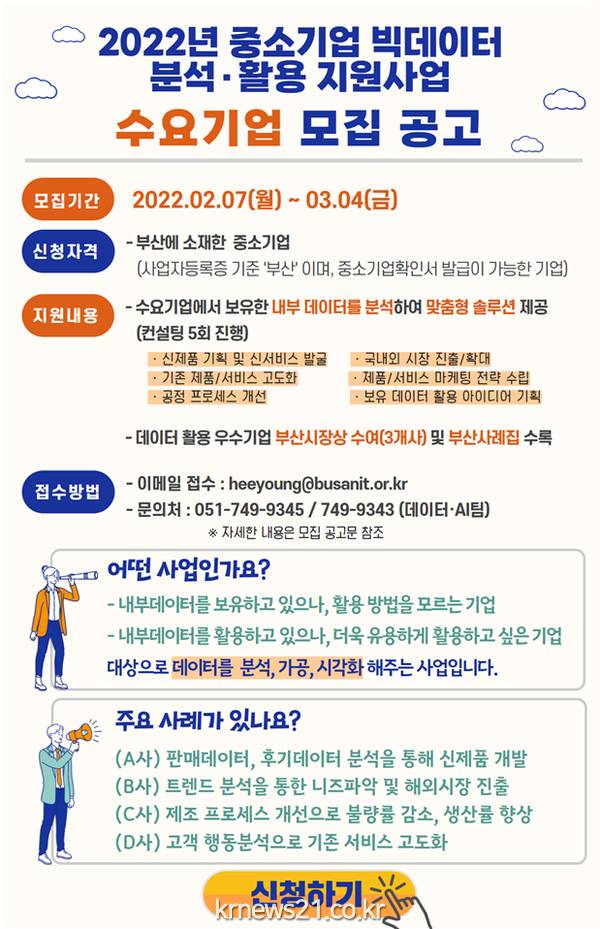 이준승 부산시 디지털경제혁신실장은 “올해부터 시 자체 사업으로 전환하여 안정적이고 체계적인 사업 추진이 가능해졌다”라며, “빅데이터 분석과 활용을 통해 새로운 비즈니스를 창출하고 기업 경쟁력을 강화할 수 있도록 하고 나아가 지역기업의 디지털 전환을 빨리 이끌어내도록 다양한 지원사업을 추진하겠다”고 전했다.