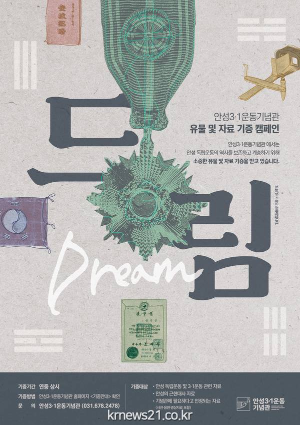 ▲ 사진=안성시안성3.1운동기념관에서는 안성 독립운동의 역사를 보존하고 계승하기 위해 유물 및 자료 기증 캠페인 ‘드림(Dream)’을 펼친다.