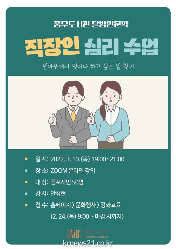 ▲ 사진=김포시김포시 풍무도서관은 달밤인문학 「직장인 심리 수업」을 오는 3월 10일 목요일 오후 7시 줌(ZOOM)을 통한 비대면 온라인 강의로 운영한다.