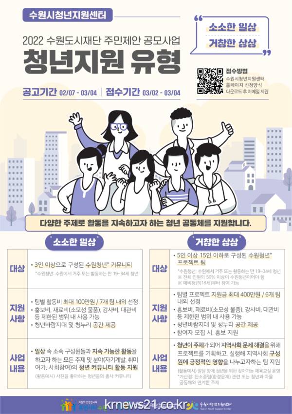 공모 분야는 ‘소소한 일상’, ‘거창한 상상’ 2개 유형이다. 수원시에 거주하거나 수원시 소재 직장·학교 등을 다니는 만 19~34세 청년으로 구성된 소모임·단체 등이 신청할 수 있다.