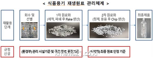특히 식품용기에 사용되는 투명페트병 재생원료는 국민건강 보호를 위해 안전성 확보가 필수적인 점을 고려하여 환경부-식품의약품안전처 2중 검증체제를 마련하기로 했다.