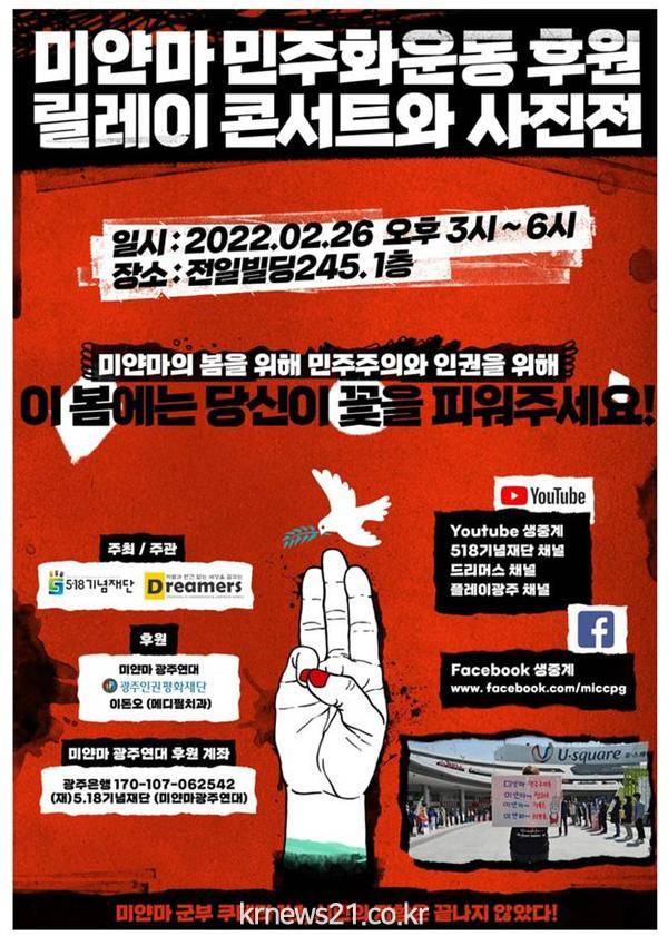 ▲ 사진=광주광역시광주광역시는 오는 26일 광주 대표 복합문화공간인 전일빌딩245에서 미얀마 군부 쿠데타에 맞선 저항의 1년을 기념하는 후원 릴레이 콘서트와 사진전이 열린다고 밝혔다.