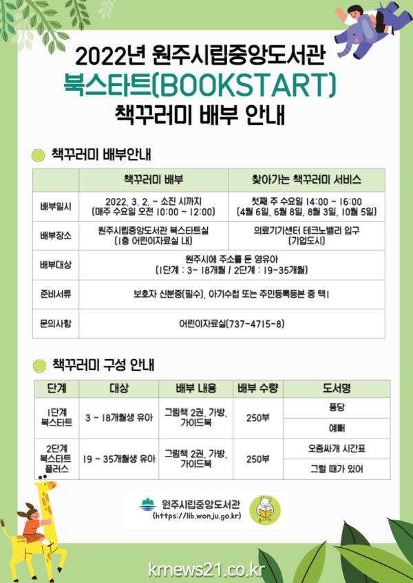 책꾸러미는 3월 2일부터 매주 수요일 선착순으로 배부되며, 시립중앙도서관 1층 어린이자료실 내 북스타트실(10:00~12:00), 중천철학도서관 1층 자료실(14:00~16:00)에서 받을 수 있다.