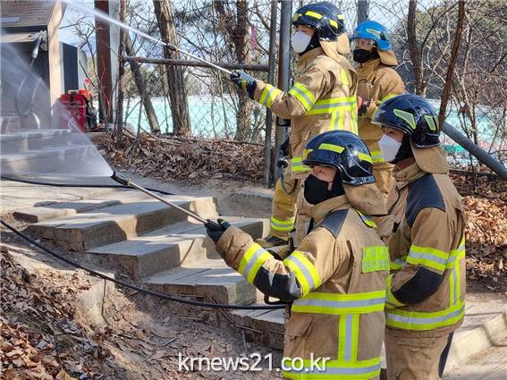 이번 훈련은 ▲ 산불 발생 시 인근의 시설물과 인명보호에 대한 최우선 대응 ▲ 산불진화용 호스릴이 장착된 소방펌프차의 전술적 배치와 입체적 운용 ▲ 산불 진행 상황별 추가 인력과 장비 투입 ▲ 의용소방대원 비상소집 및 동원자원에 대한 적절한 임무 부여 등에 중점을 두었다.