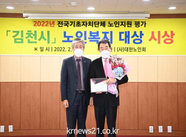 ▲ 사진=김천시김천시는(시장 김충섭)는 사단법인 대한노인회에서 주최하는 2022년 제1회대한노인회 노인복지대상 기초자치단체분야에서 경상북도 유일하게“대상”을수상하는 쾌거를 거뒀다.
