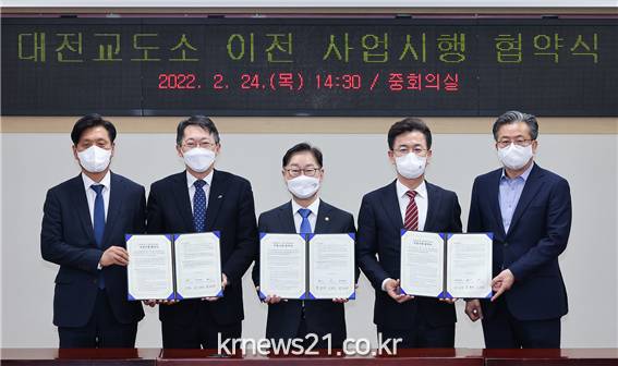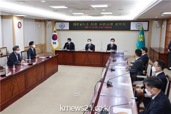 대전시, 법무부, LH는 24일 대전시청 중회의실에서 ‘대전교정시설 이전·신축 및 이전적지 개발사업 시행협약’을 체결하고 대전교도소 신축 이전과 이전부지 개발에 적극 협력하기로 했다.