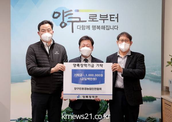 ▲ 사진=양구군양구군청에 따르면, 양구친환경농업인연합회는 28일 양구군청을 방문해 양록장학금 100만원을 조인묵 양구군수에게 기탁했다.