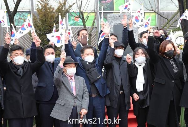 ▲ 사진=광명시광명시(시장 박승원)는 제103주년 3.1절을 맞아 1919년 3월 광명지역 청년들이 독립만세를 외쳤던 일제 항거의 역사를 간직한 온신초등학교 3.1독립만세기념비 앞에서 기념행사를 가졌다.