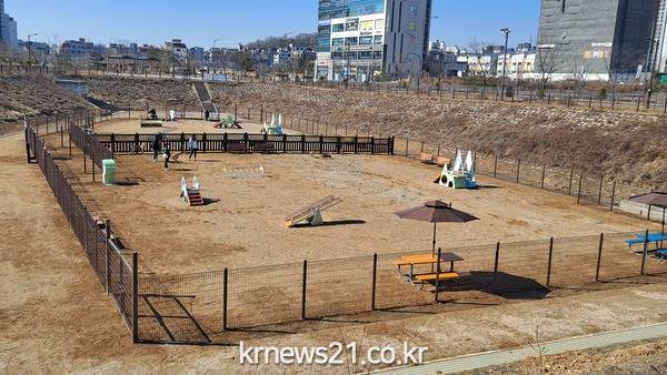 반려견 놀이터는 동삭1저류지(2,200㎡), 서부공설운동장(2,800㎡), 신당근린공원(1,200㎡)에 200마리를 동시에 수용할 수 있는 규모로 조성되었다.