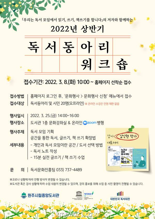 ▲ 사진=원주시원주시립중앙도서관은 독서동아리 활성화를 위해 오는 3월 25일에 2022년 상반기 독서동아리 워크숍을 개최한다.