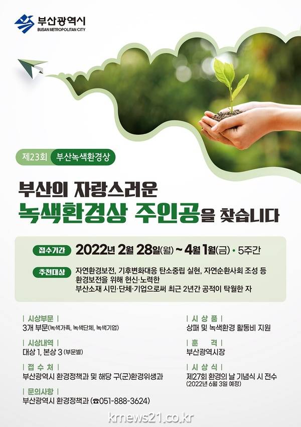 ▲ 사진=부산광역시부산시(시장 박형준)는 저탄소 그린도시 실현 등에 솔선수범하고 지역 환경 개선에 기여한 ‘부산녹색환경상’ 후보자를 오는 4월 1일까지 공모한다고 밝혔다.