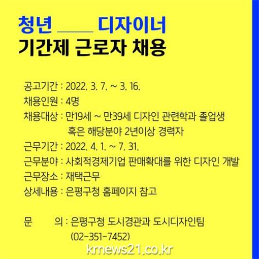 채용은 은평구 거주자를 우대하며, 코로나19 확산 예방을 위해 채용된 근로자는 재택근무를 병행할 예정이다.