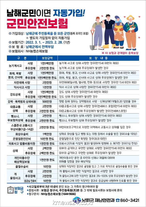▲ 사진=남해군남해군은 일상생활에서 발생하는 예상치 못한 각종 재난·사고로 피해를 당한 군민들의 생활안정을 위해 ‘군민안전보험’을 갱신 가입했다고 밝혔다.