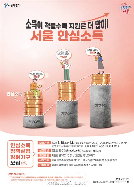 신청은 온라인(ssi.seoul.go.kr)으로 접수 가능하며, 자세한 사항은 서울시 다산콜센터, 서울 안심소득 홈페이지(seoulsafetyincome.seoul.kr)에서 확인할 수 있다.