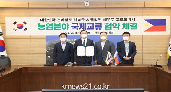 해남군은 고구마 정식과 마늘·양파 수확 등 본격적인 농번기철에 앞서 농촌 인력난 해결을 위해 15일 군청 상황실에서 필리핀 세부 코르도바시와 외국인 계절근로자 양해각서를 체결했다.