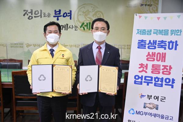 ▲ 사진=부여군부여군(군수 박정현)과 부여새마을금고(이사장 김영구)는 16일 ‘출생 축하! 우리아이 생애 첫 통장 개설 사업’ 추진을 위한 업무협약을 체결했다.