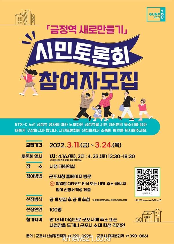 토론회 참가 자격은 만 18세 이상의 군포시 거주자, 또는 군포시 소재 사업자, 직장인, 재학생이며, 오는 3월 24일까지 군포시 홈페이지 메인 팝업창의 QR코드 인식, 또는 네이버 폼(http://naver.me/x9LlzzZr)으로 신청하면 된다.