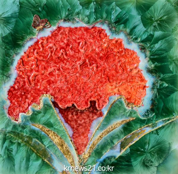 ▲ 사진=도자회화 설숙영 작가 제공매끄러운 도판에 사방으로 뻗은 결정체 모양들의 조합으로 펼쳐진 이미지들의 신비를 감상하는 도자회화 설숙영 작가의 '신비, 미스테리展'이 2022년 3월 19일(토) ~ 4월 10일(일)까지 경기도 양주 소재의 나눔 갤러리 블루(관장 박선미)에서 전시를 진행 중에 있다. 일반적인 캔버스가 아닌 도판에 자개, 금박, 실크 등 융복합 재료로 우주의 빛을 맑고 푸르게 만들어 몽환적인 신비의 세계로 빠져들게 만들고 있다. 출품작의 특징으로 노란색의 순금은 주제와 포인트를 부각시키는 역할을 하고 시시각각 변하는 초록 물결의 오로라는 생동감으로 가득하다.