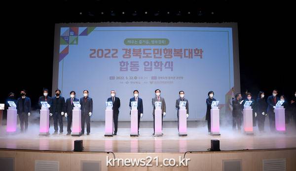 ▲ 사진=경상북도경상북도는 22일 도청 동락관에서 19개 시군 및 4개 권역 대학 캠퍼스 신입생과 관계자 등 299명이 참석한 가운데‘경북도민행복대학 합동입학식’을 개최했다.
